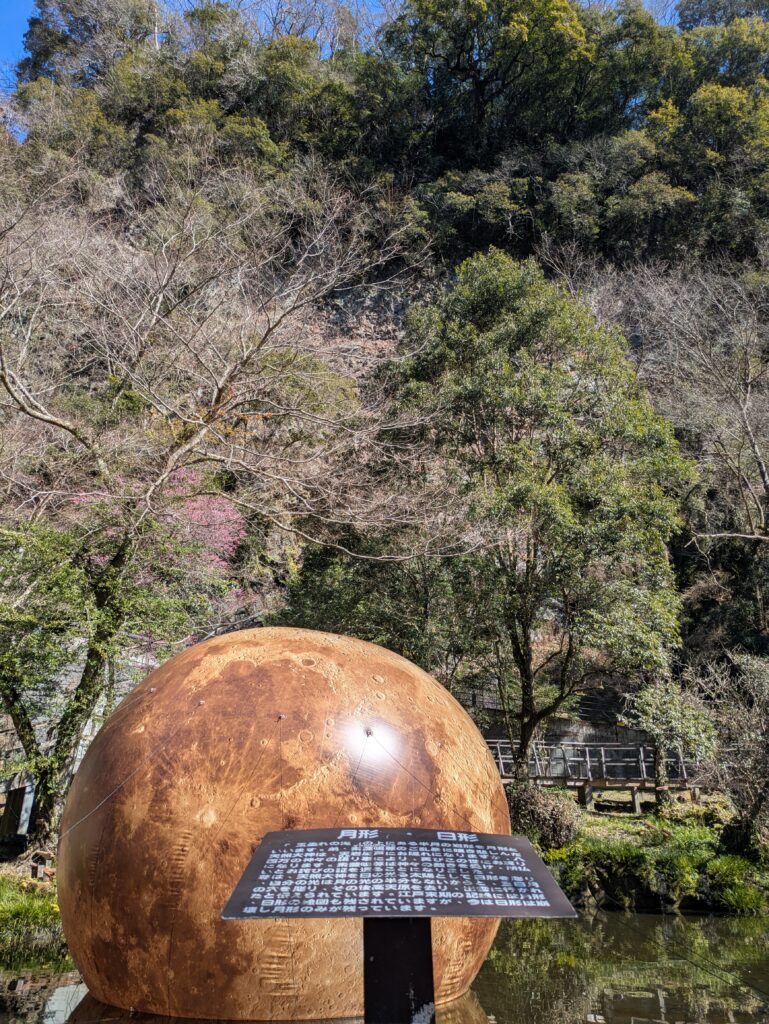 高千穂峡の駐車場から御橋を渡って突き当りにある崖の上方に月形 日形があります。崖の岩の中に月形が見られます。日形は崩壊して現在は月形のみ残っているそうです。月形のオブジェは最近できたそう?夜は期間限定でライトアップをしているとか。