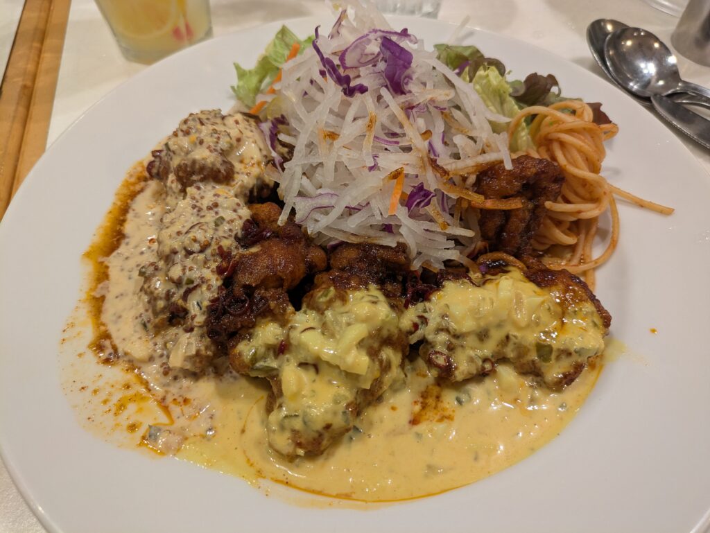 基本の南蛮にするか迷いつつも、刺激を求め旨辛Wを選択。美味しかった!美味しかったのですが、ソースがサラダに浸透してベチョベチョなのは少し残念でした。それなら基本の南蛮にしたのにな…と。いやでも美味しかったです。